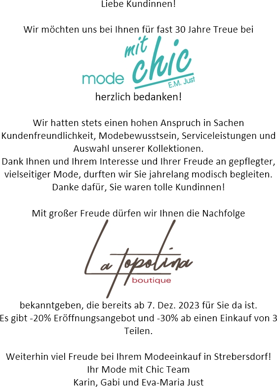 ADRESSE:Mode mit ChicInh. Eva Maria JustRußbergstraße 21210 Wien KONTAKT:Tel: +43 (1) 292 10 83